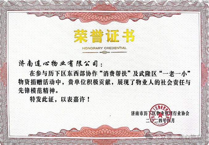 濟(jì)南連心物業(yè)有限公司榮獲歷下區(qū)物業(yè)管理行業(yè)協(xié)會(huì)“優(yōu)秀會(huì)員單位”“歷下區(qū)東西部協(xié)作會(huì)員單位”等榮譽(yù)稱號(hào)。