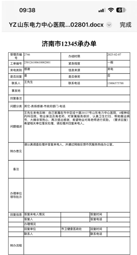 王先生的家屬在山東電力中心醫(yī)院4樓神經(jīng)內科住院期間,物業(yè)保潔員高桂萍幫助搬運病號、認真清理病房衛(wèi)生。高桂萍的用貼心周到服務,為就診提供全程幫助,讓病號感受到醫(yī)院就診時的溫暖與關懷。為表達感謝,王先生撥打12345市民熱線,希望通過山東電力中心醫(yī)院和濟南連心物業(yè)領導對保潔高老師給予表揚,以示對她工作的肯定和鼓勵。