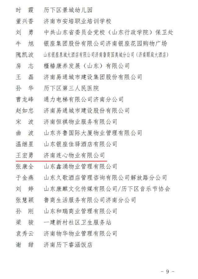 2025年3月17日,濟南市歷下區(qū)安全生產(chǎn)委員會發(fā)布通報,濟南連心物業(yè)有限公司黨支部書記、董事長王宏勇被評為2024年度歷下區(qū)“安全生產(chǎn)工作表現(xiàn)突出個人”。