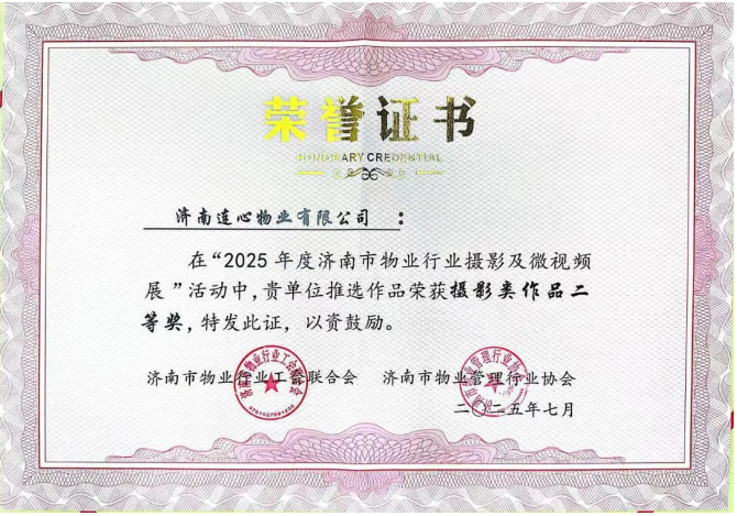 2025年7月23日,濟南市物業(yè)行業(yè)2025年度工會干部培訓(xùn)班暨攝影微視頻展表揚活動在博鰲大廈舉行。濟南連心物業(yè)有限公司攝影作品《城市溫暖的傳遞》榮獲二等獎。