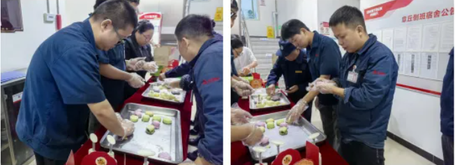 為讓重汽集團住宿職工更深度體驗節(jié)日氛圍,當天下午,“巧手月餅DIY”活動在宿舍區(qū)歡樂開啟?;顒油ㄖ唤?jīng)發(fā)布,便吸引了眾多職工踴躍報名。傍晚六點,活動現(xiàn)場已是人頭攢動,歡聲笑語不絕于耳?,F(xiàn)場布置喜慶溫馨,操作臺上整齊擺放著由食堂提前備好的面團、豆沙、蓮蓉等多種餡料,以及各式精美的月餅模具。在認真了解從和面、分劑、包餡到壓模、烘烤的制作步驟后,大家迫不及待地動手實踐,現(xiàn)場氣氛熱烈,笑聲此起彼伏。忙碌一天的職工們此刻圍聚在一起,互相交流制作技巧,分享工作與生活趣事,連心物業(yè)工作人員也用鏡頭記錄下一個個溫馨快樂瞬間。經(jīng)過大家巧手制作,一個個造型精美的月餅逐漸成形,滿滿的成就感與節(jié)日的喜悅洋溢在每個人的臉上。